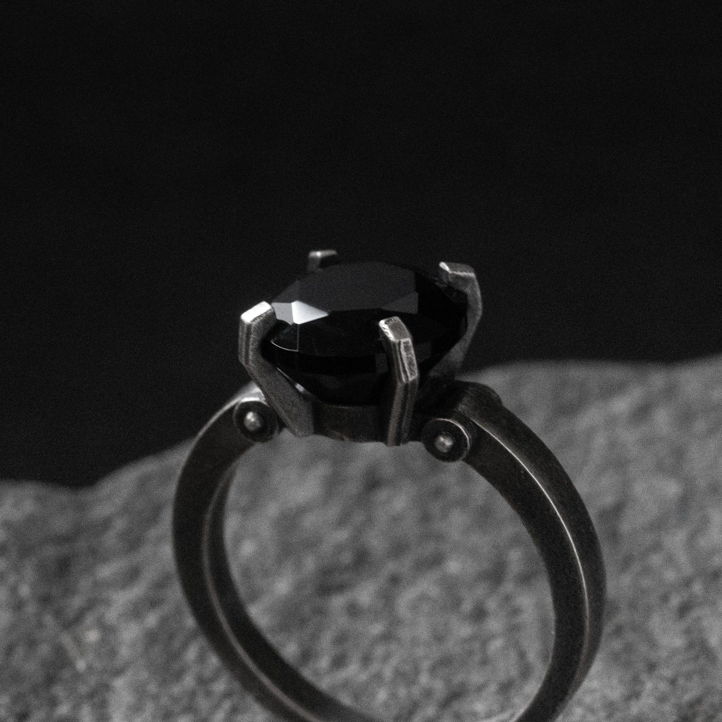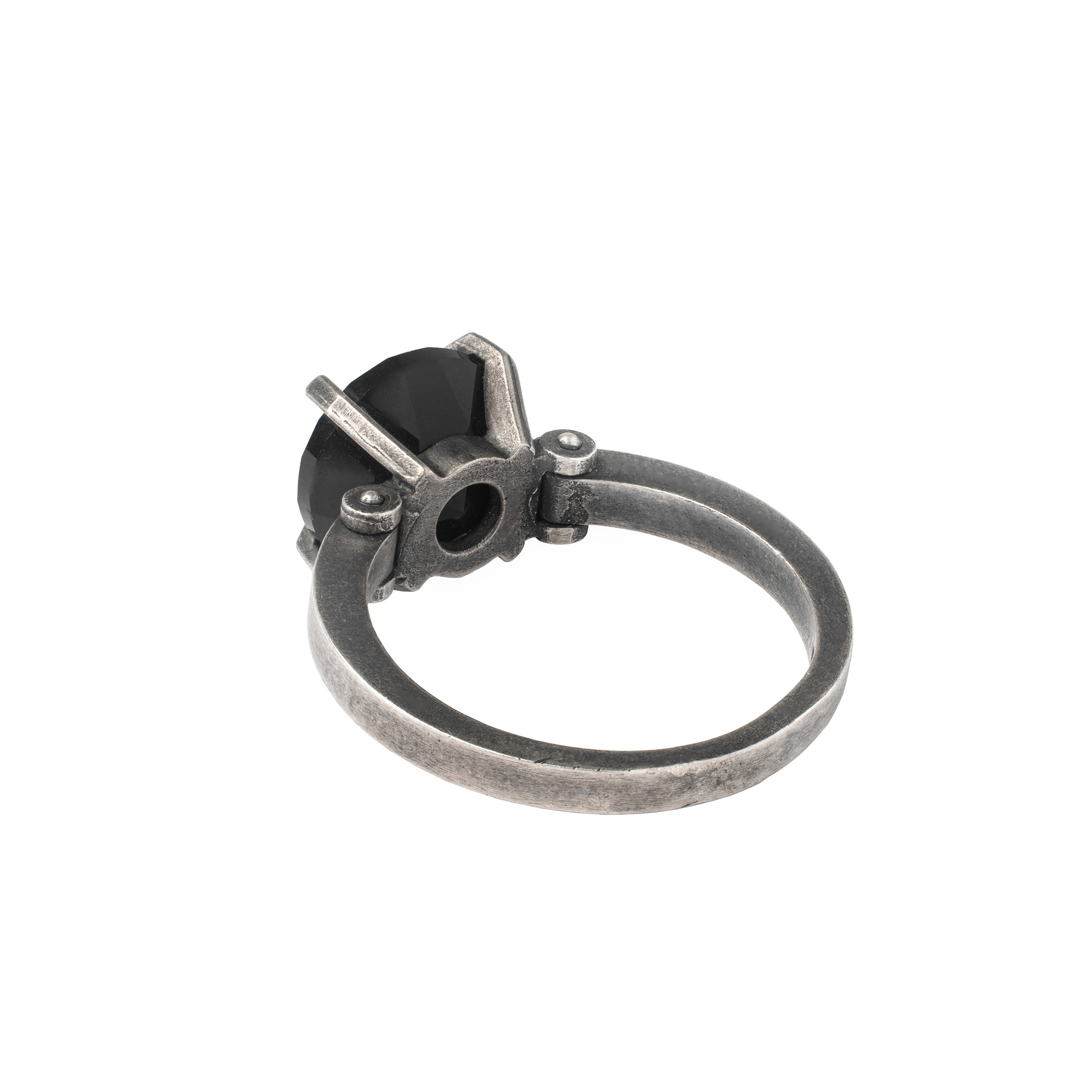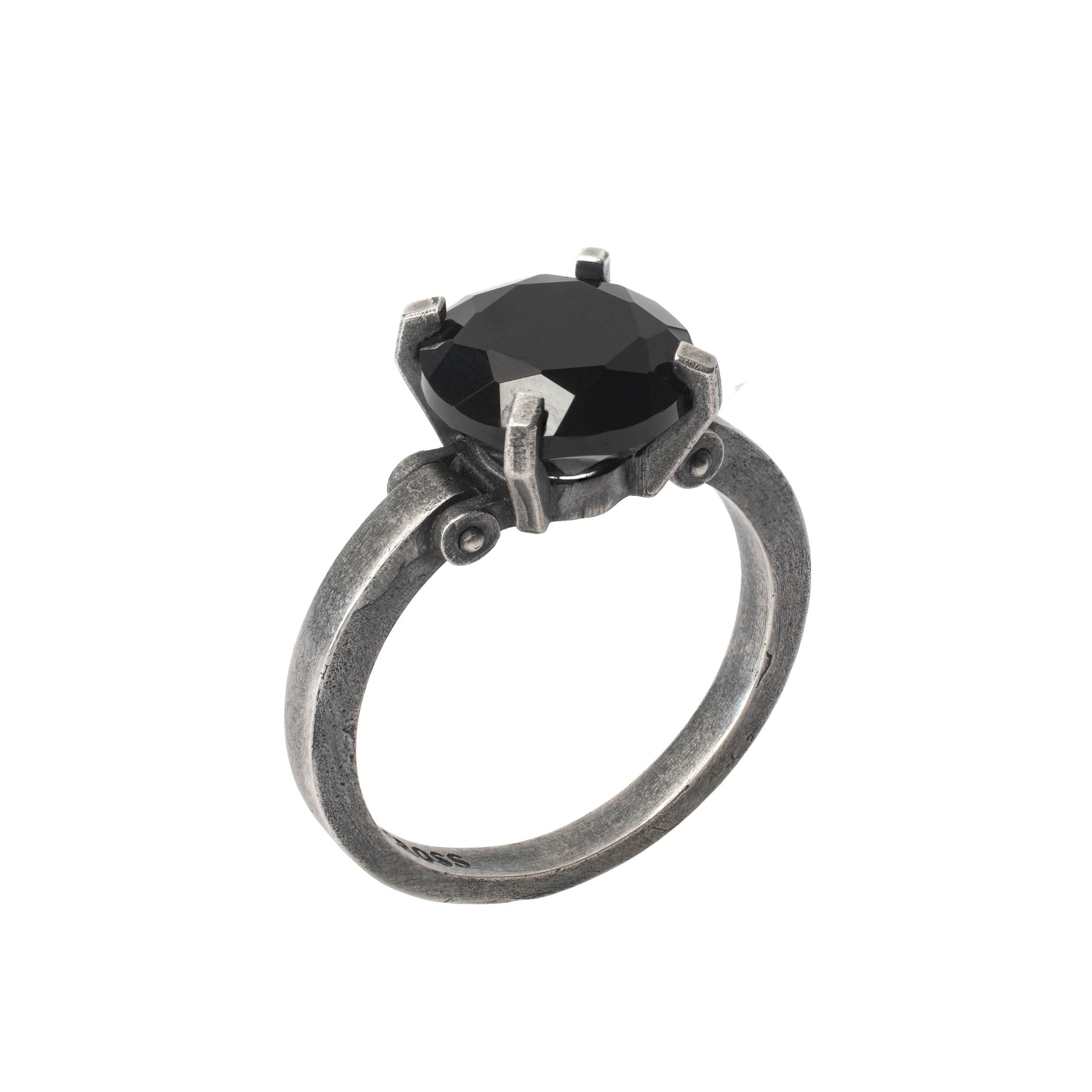 Silver ring with a single central stone made of two parts riveted together. CROSS logo on the inside of a shank. Oxidized silver with aged effect.