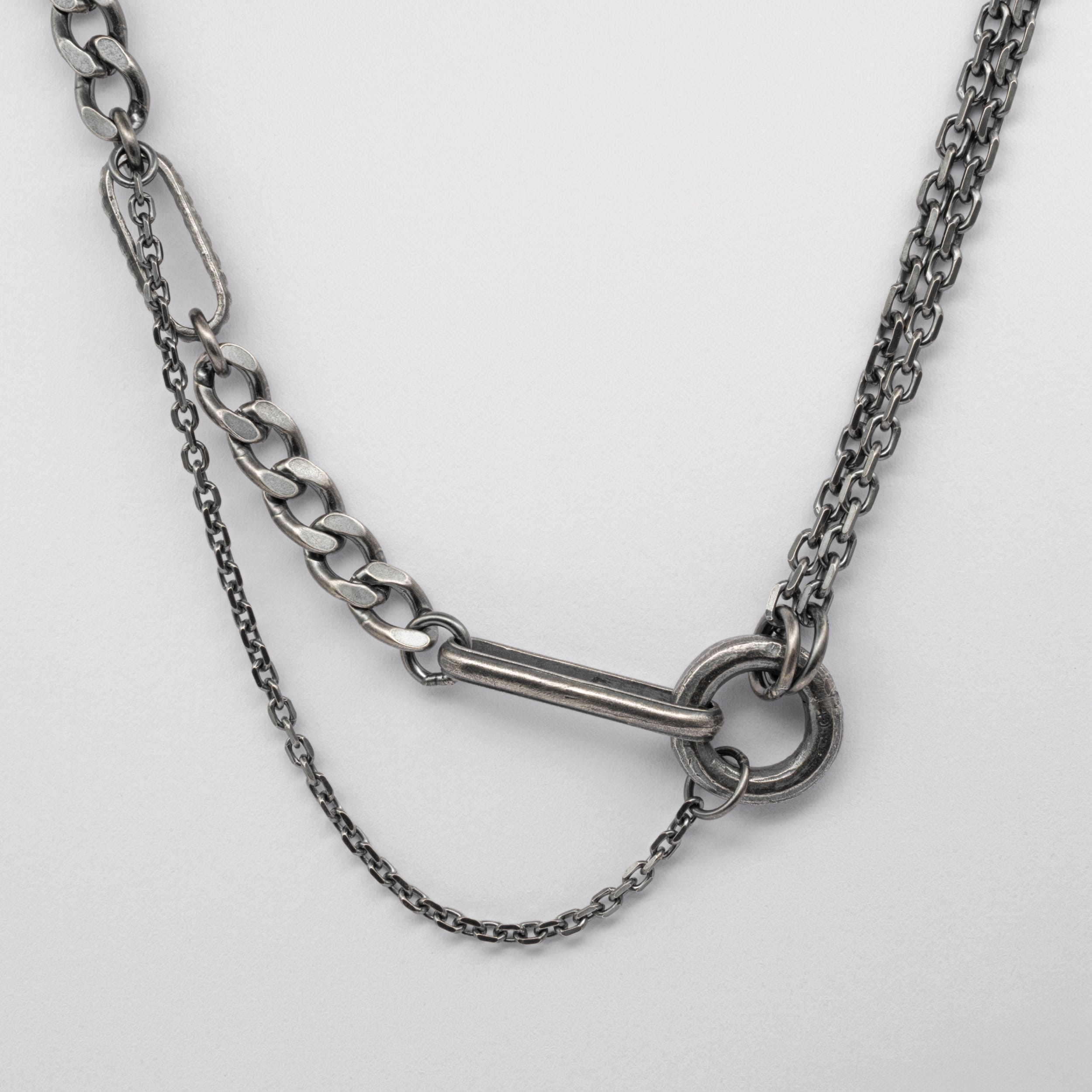 This necklace is built around contrast and structure. Different chain links are combined into a single composition, creating a dynamic rhythm and a distinctly architectural silhouette. The central metal ring acts as both a visual anchor and a functional connector.