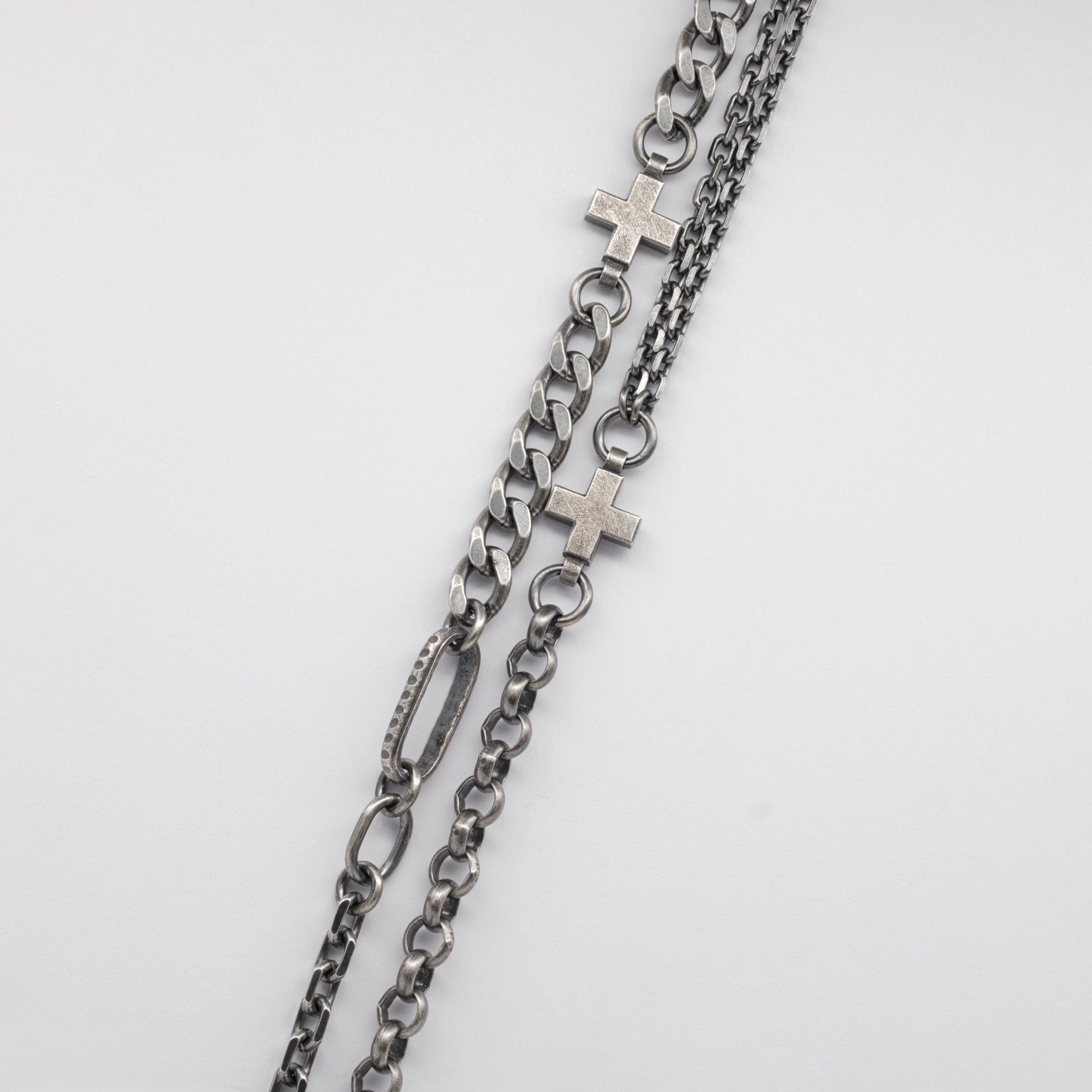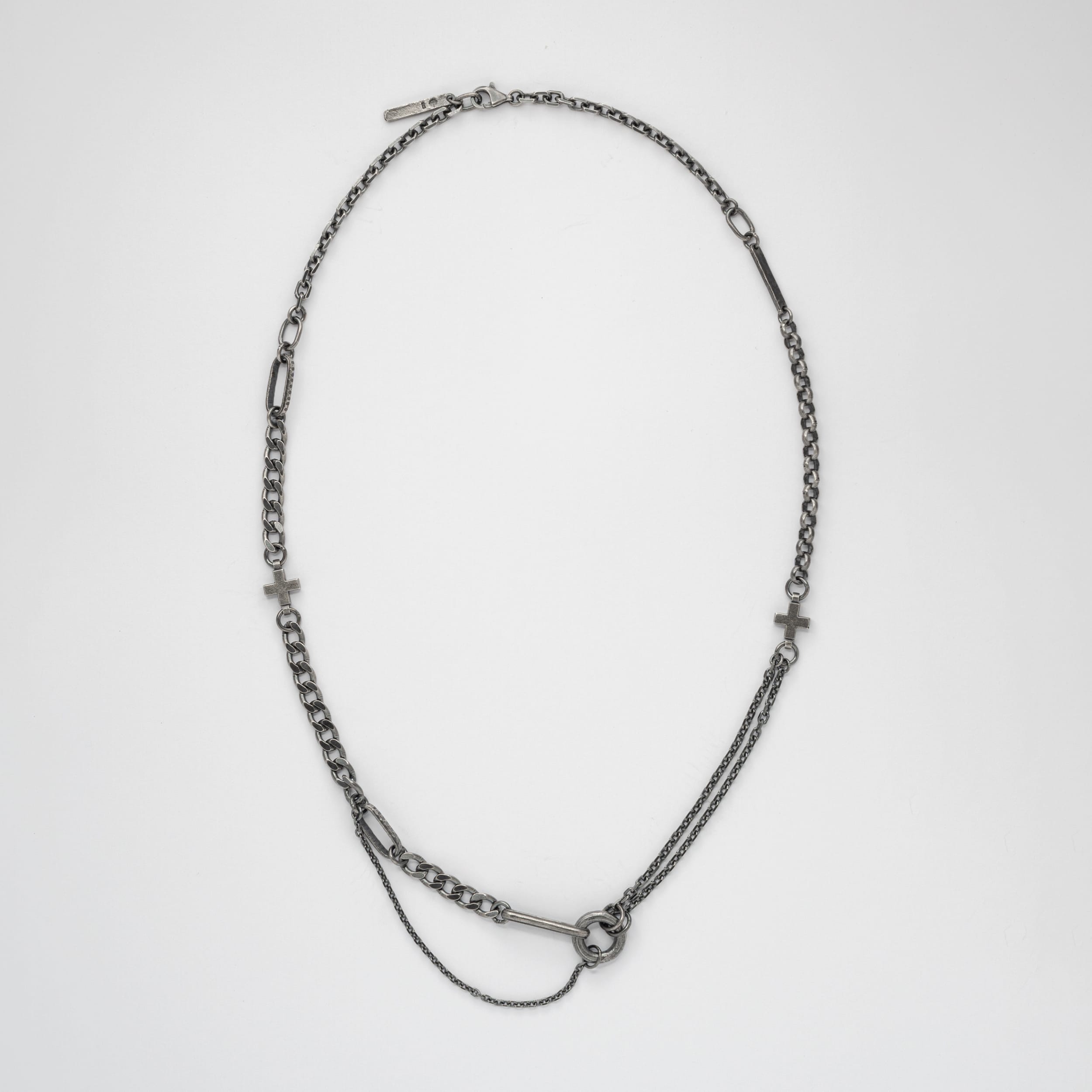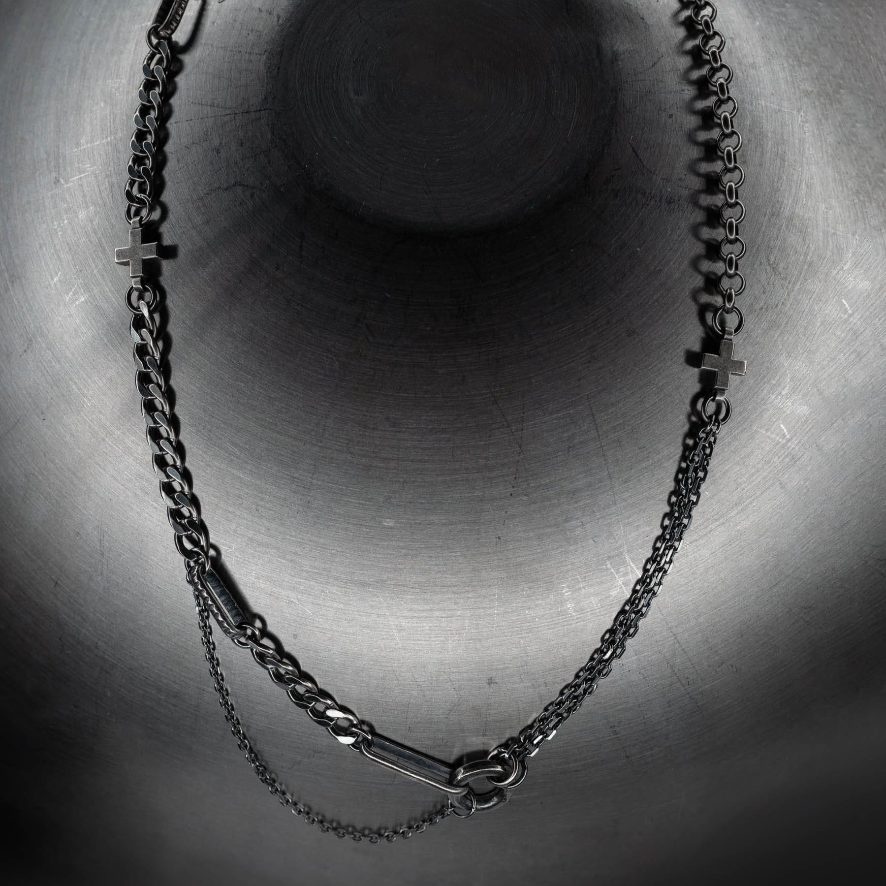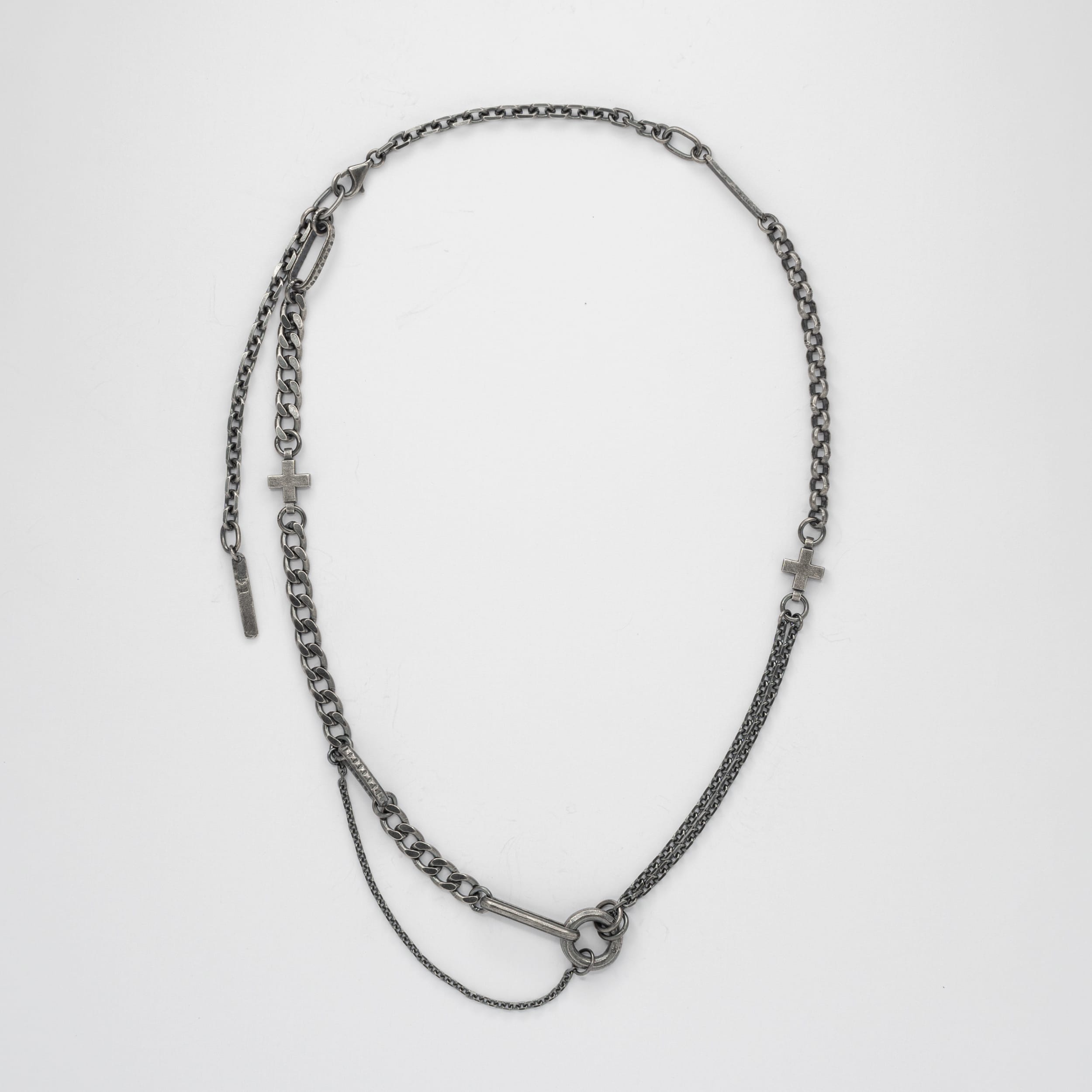 Designed to adapt to different looks, the necklace can be worn at two lengths of 55 and 47 cm, allowing it to sit higher or lower on the chest depending on styling. Industrial details, including minimal cross elements and elongated links, add character without overwhelming the form.