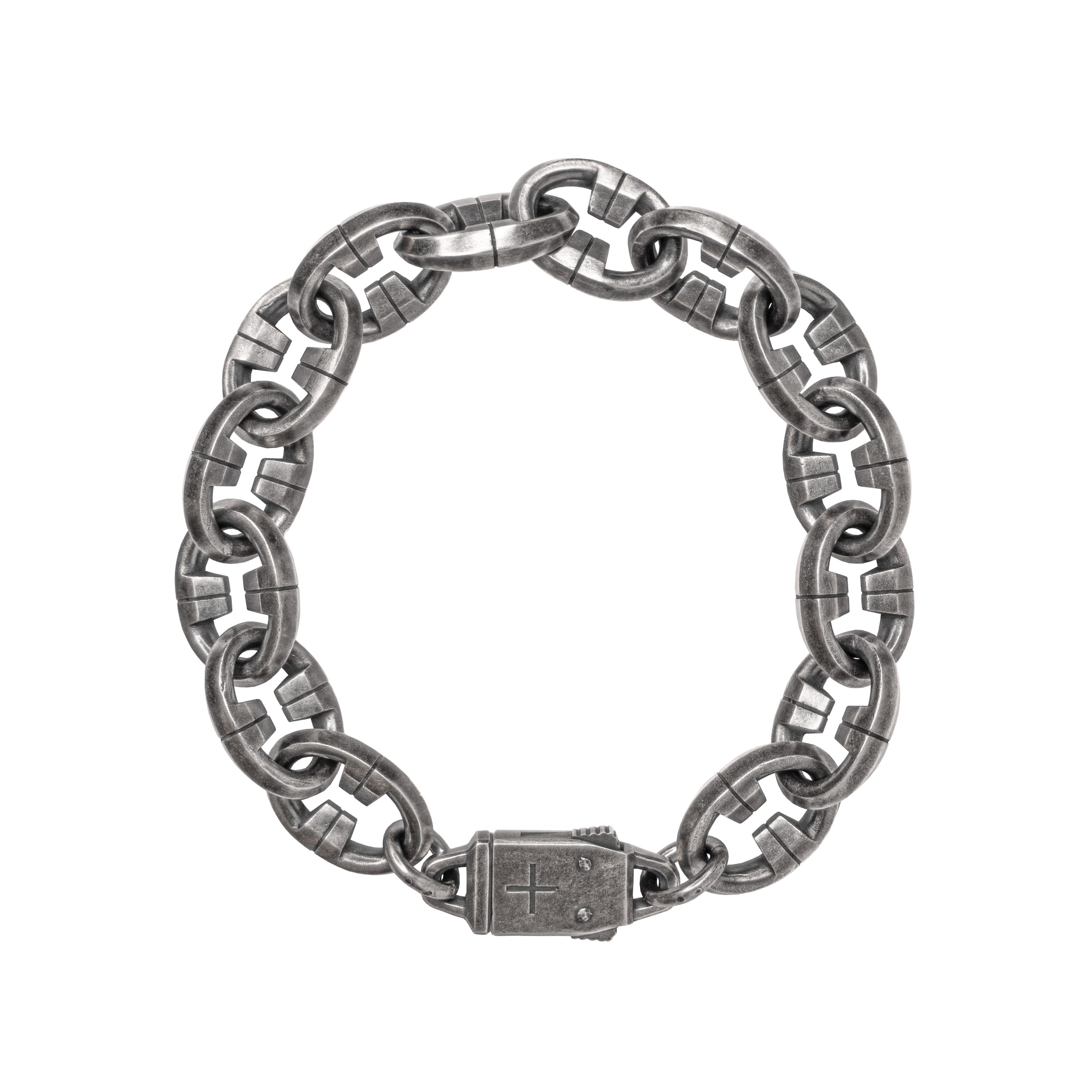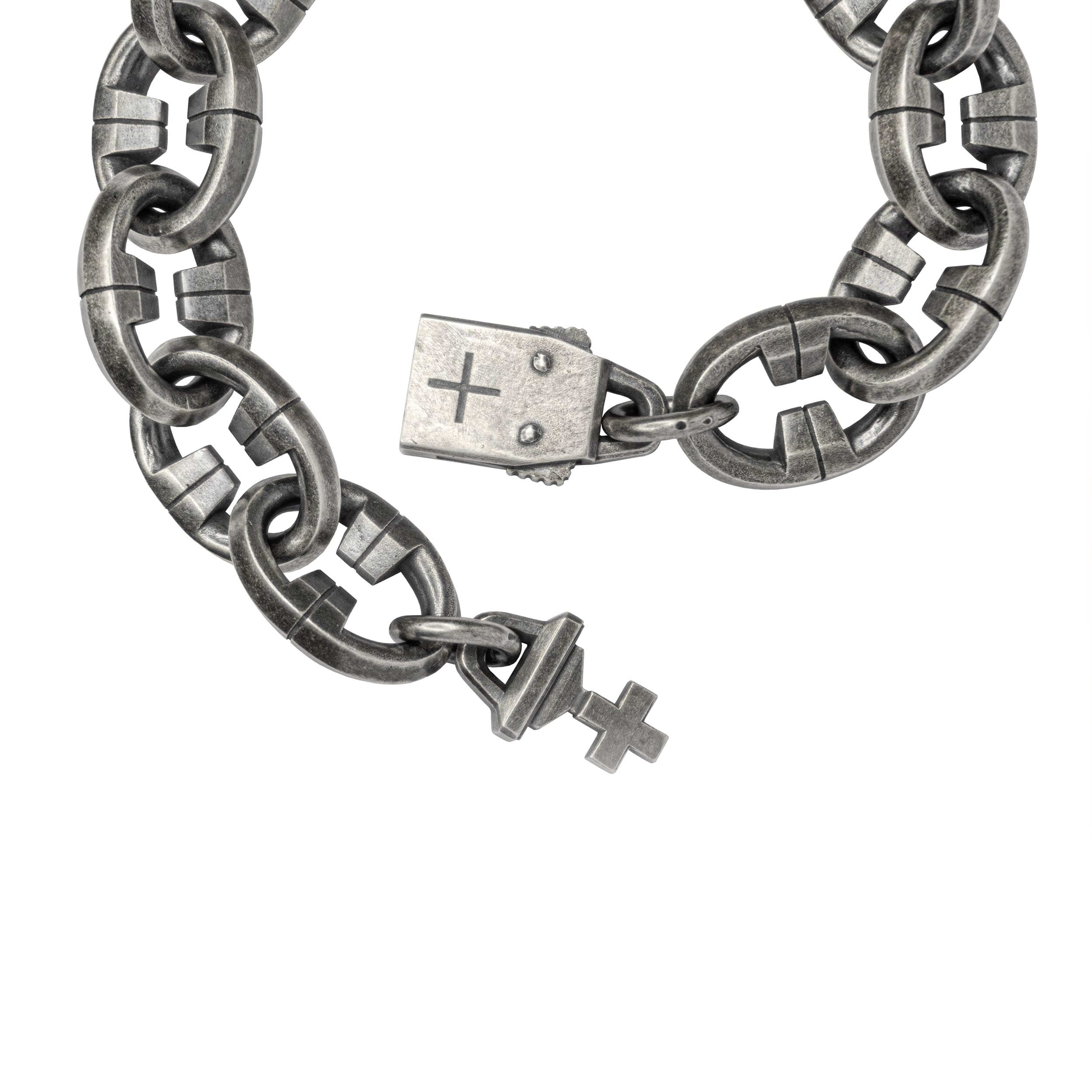 This statement chain bracelet is crafted from solid 925 sterling silver and finished with a deep oxidized patina that enhances its raw, architectural character.