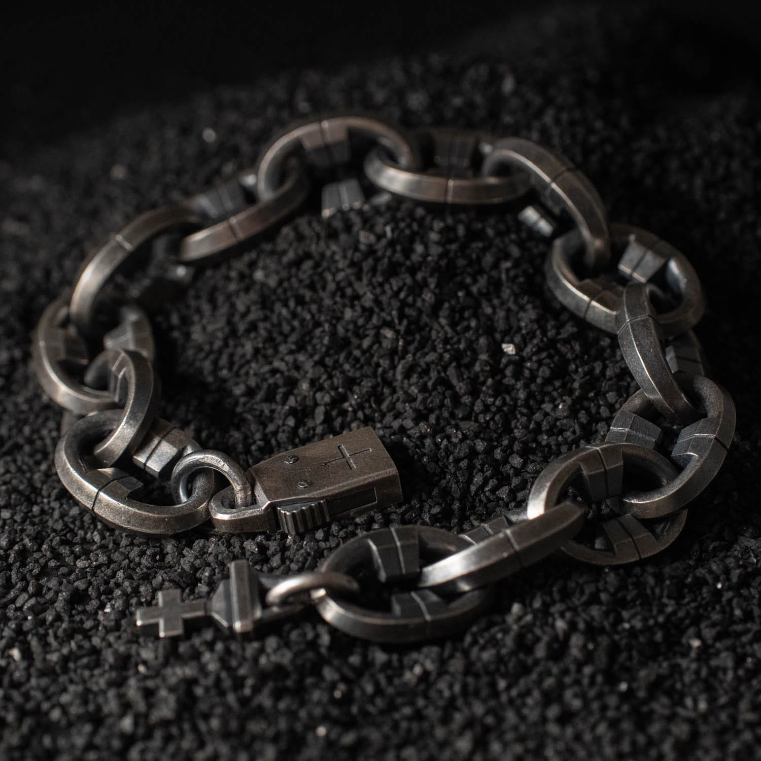 A bold, heavy sterling silver bracelet built from sculptural, interlocking links with an industrial cut-profile finish. Features the signature CROSS ELEMENTS clasp. Handcrafted, unisex, and designed for a powerful urban look.