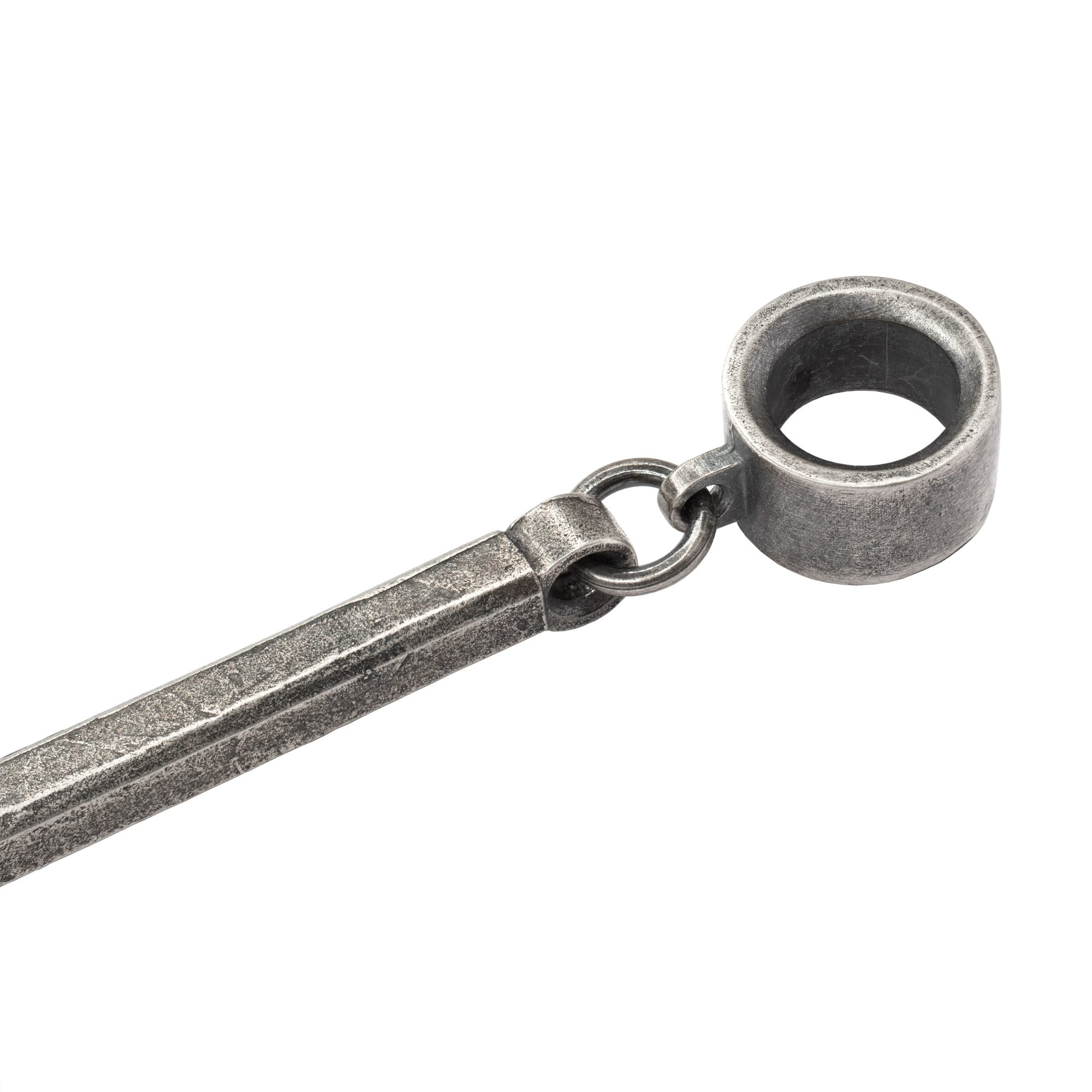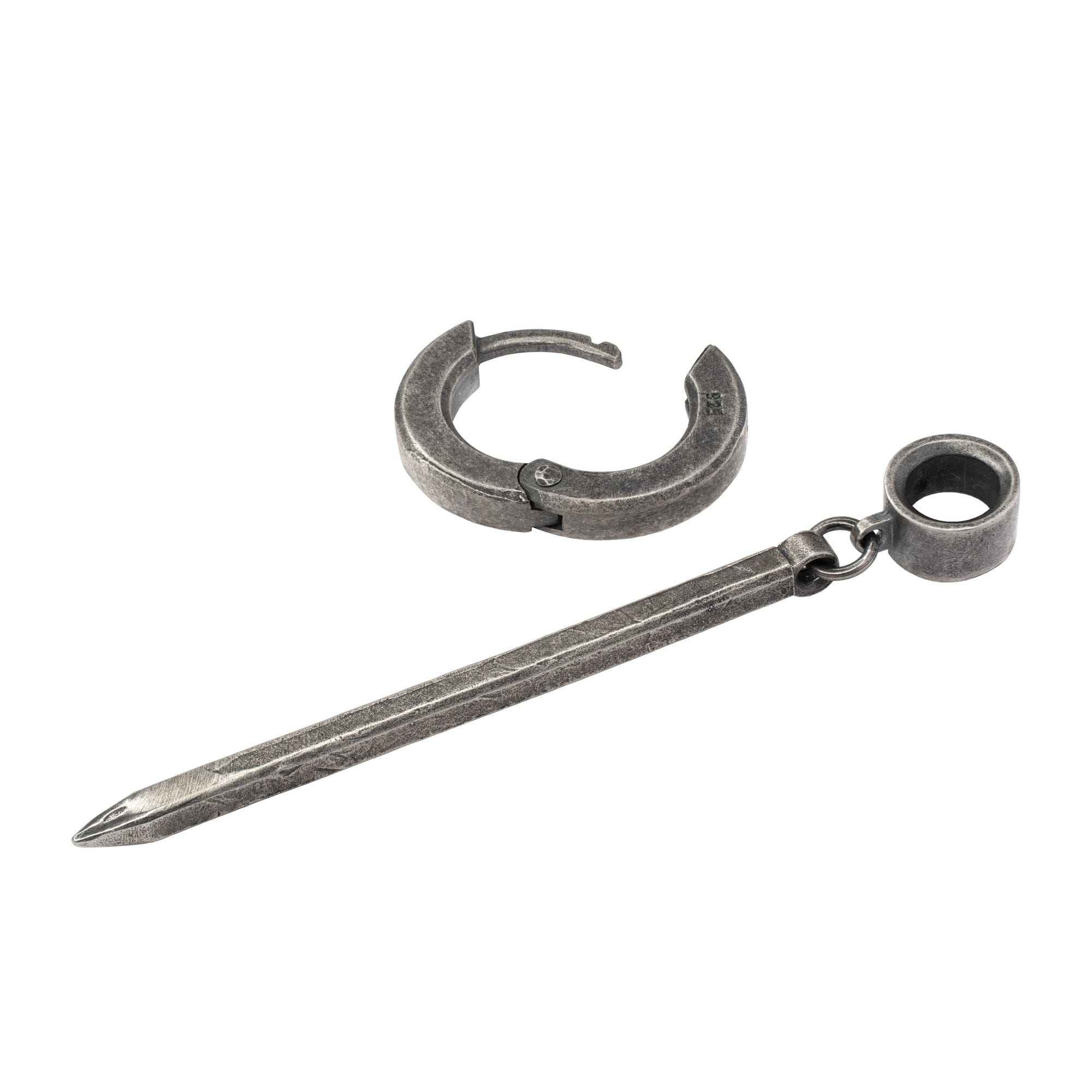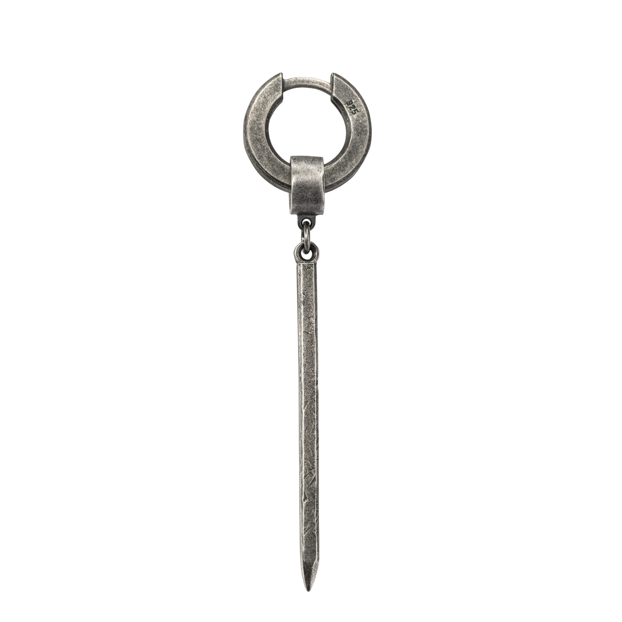 Minimalist hoop earring in oxidized sterling silver featuring a detachable elongated stick pendant. Industrial, unisex, and sculptural.