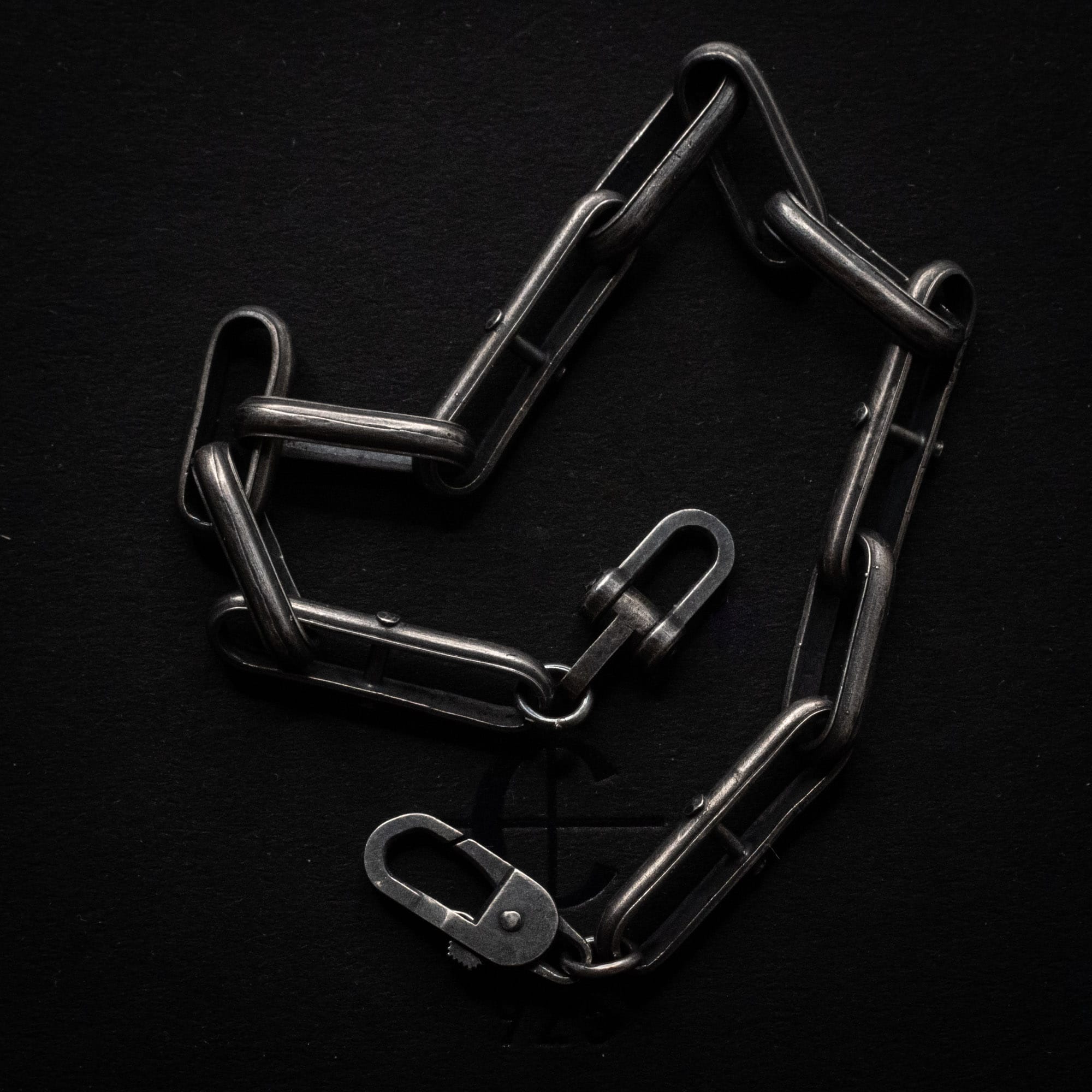 A bold unisex bracelet inspired by the raw energy of industrial chains. Handcrafted in oxidised sterling silver (925), it features anchor-style links in alternating lengths, creating a dynamic rhythm and architectural balance.