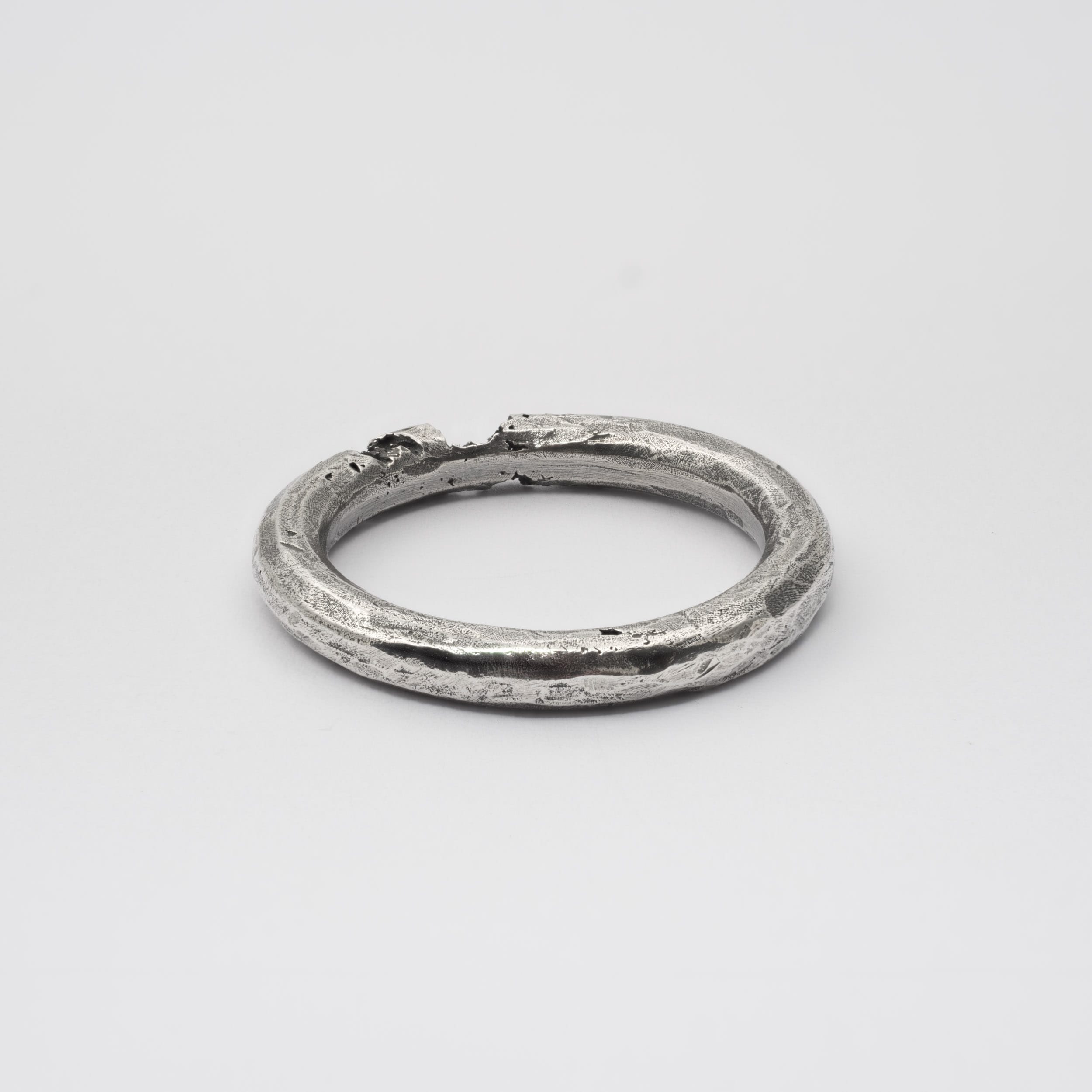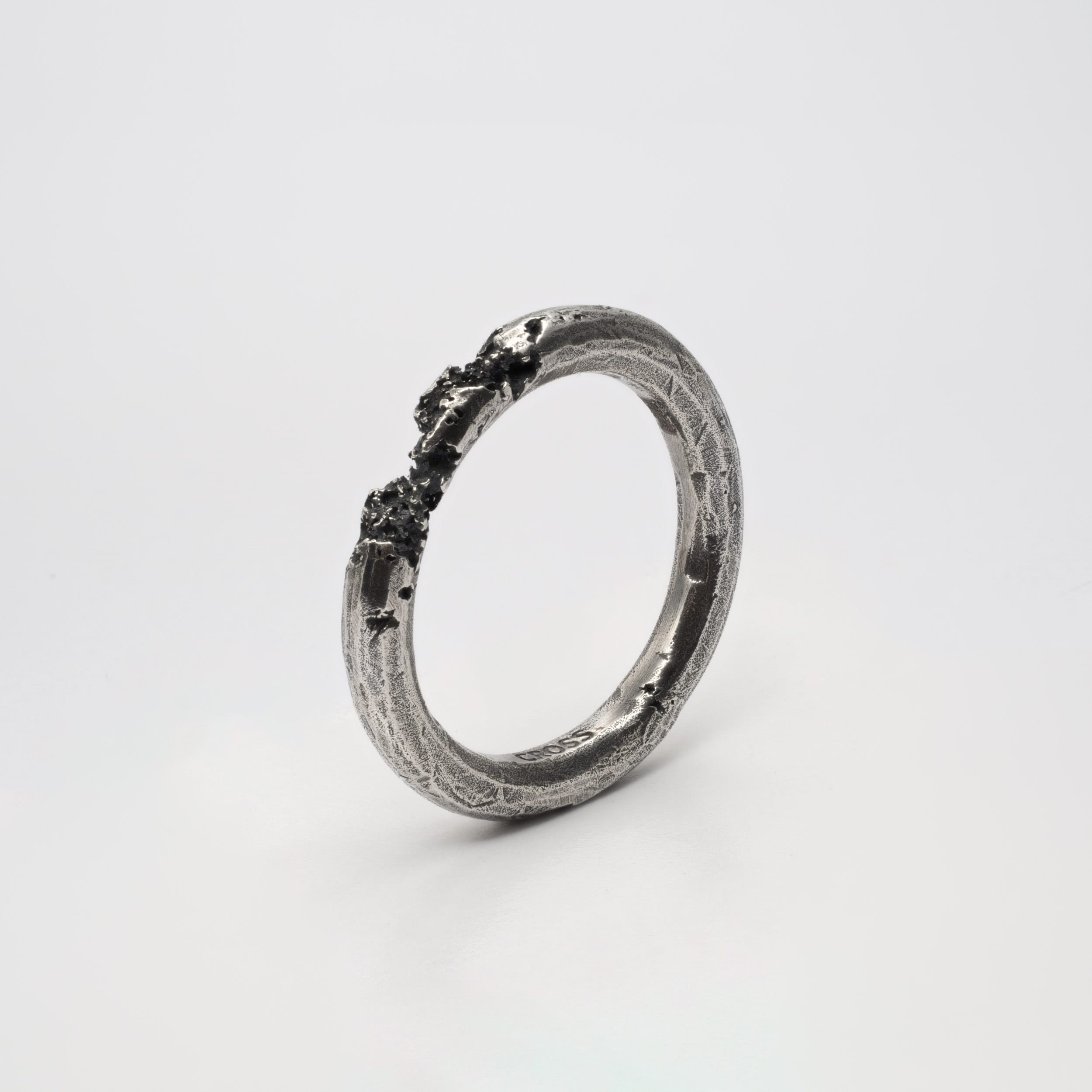 The Eroded ring is a refined interpretation of imperfection. Crafted from solid 925 sterling silver, the ring features a round profile with an organically eroded surface. The surface combines soft shine with aged character, creating a balance between polish and raw texture. The erosion appears naturally distributed, making each ring unique while maintaining a clean, minimalist silhouette. With its slim 4 mm width, this piece works effortlessly as a standalone ring or layered with other CROSS ELEMENTS designs.