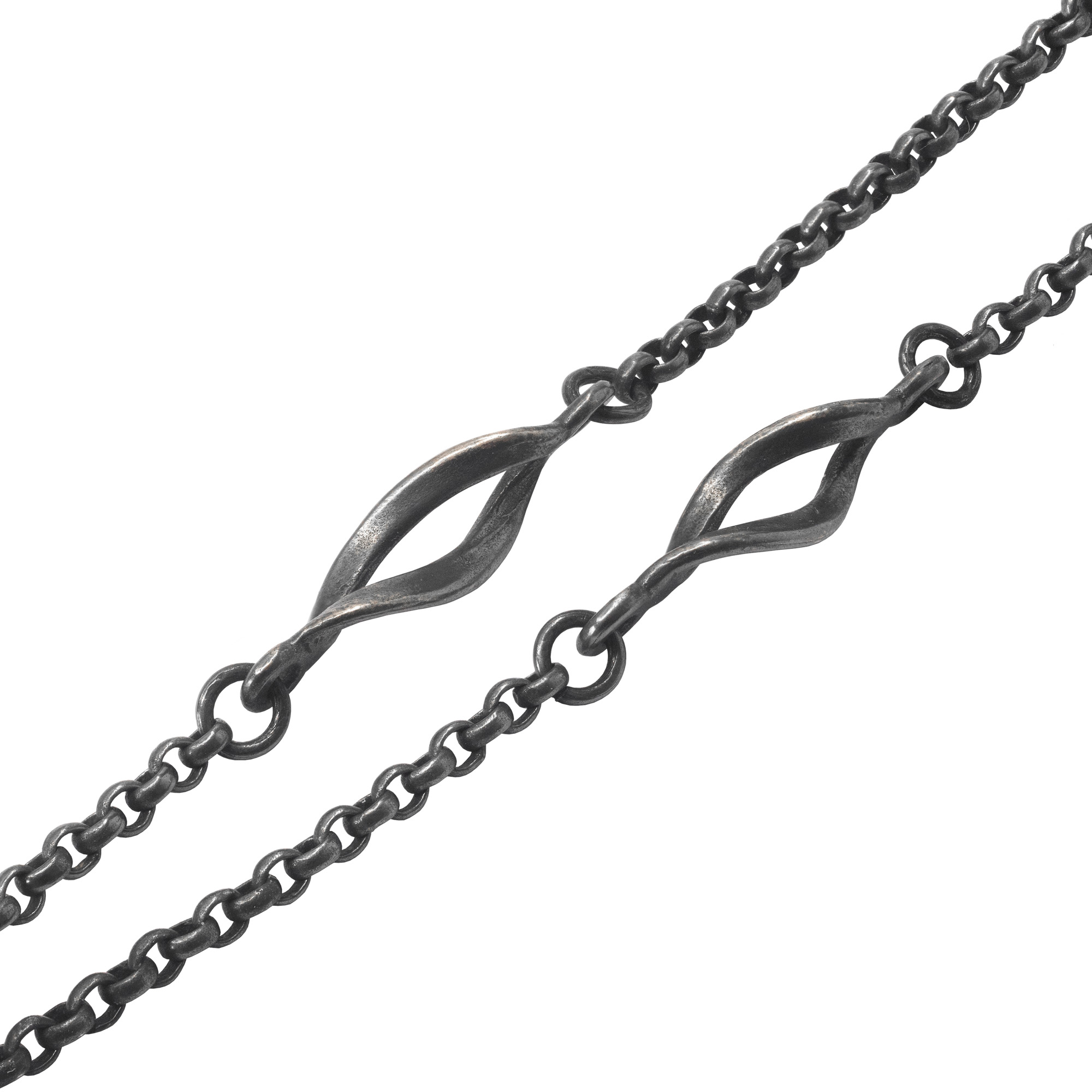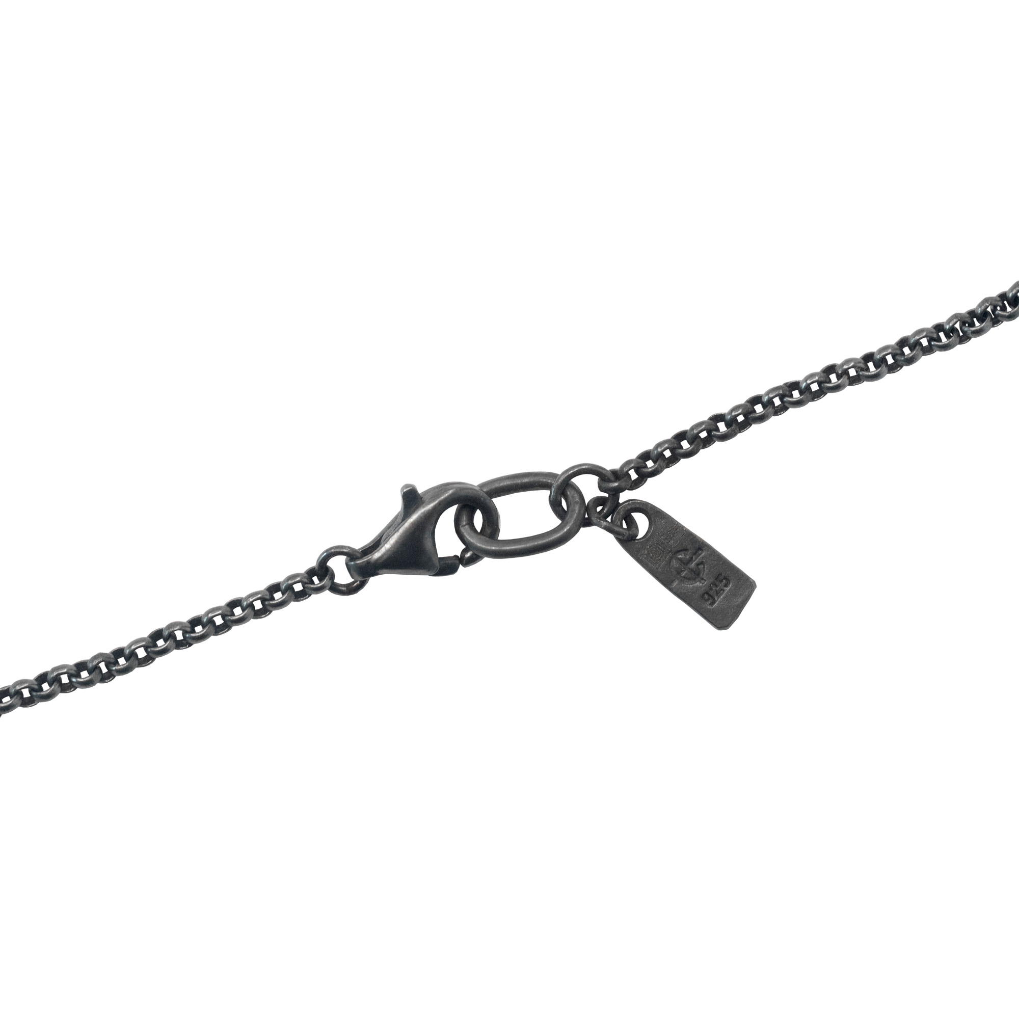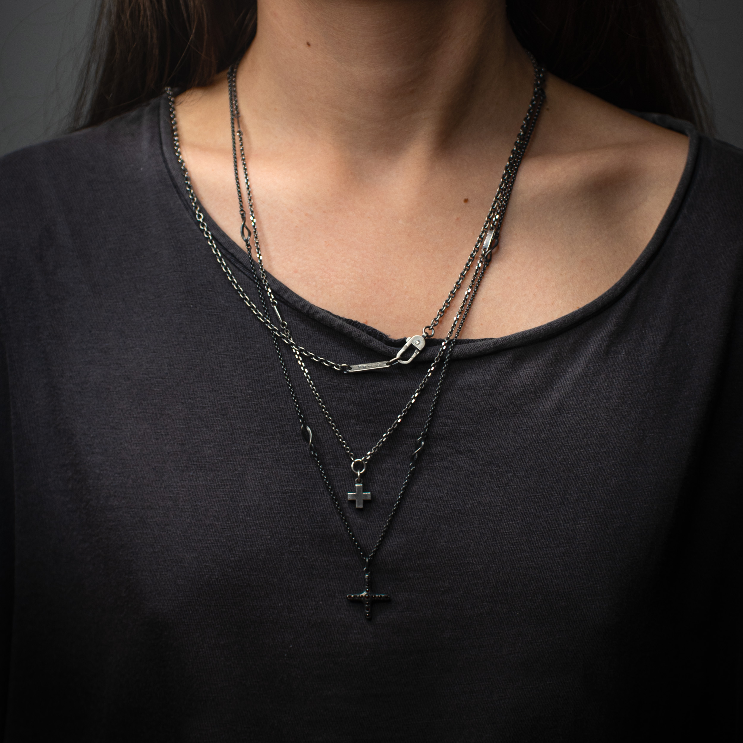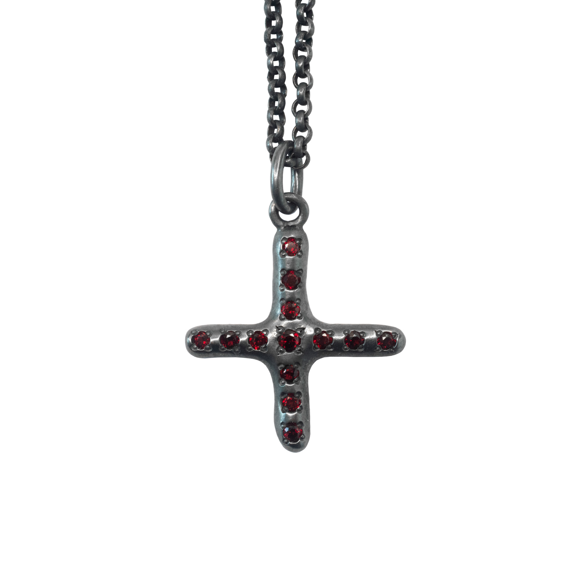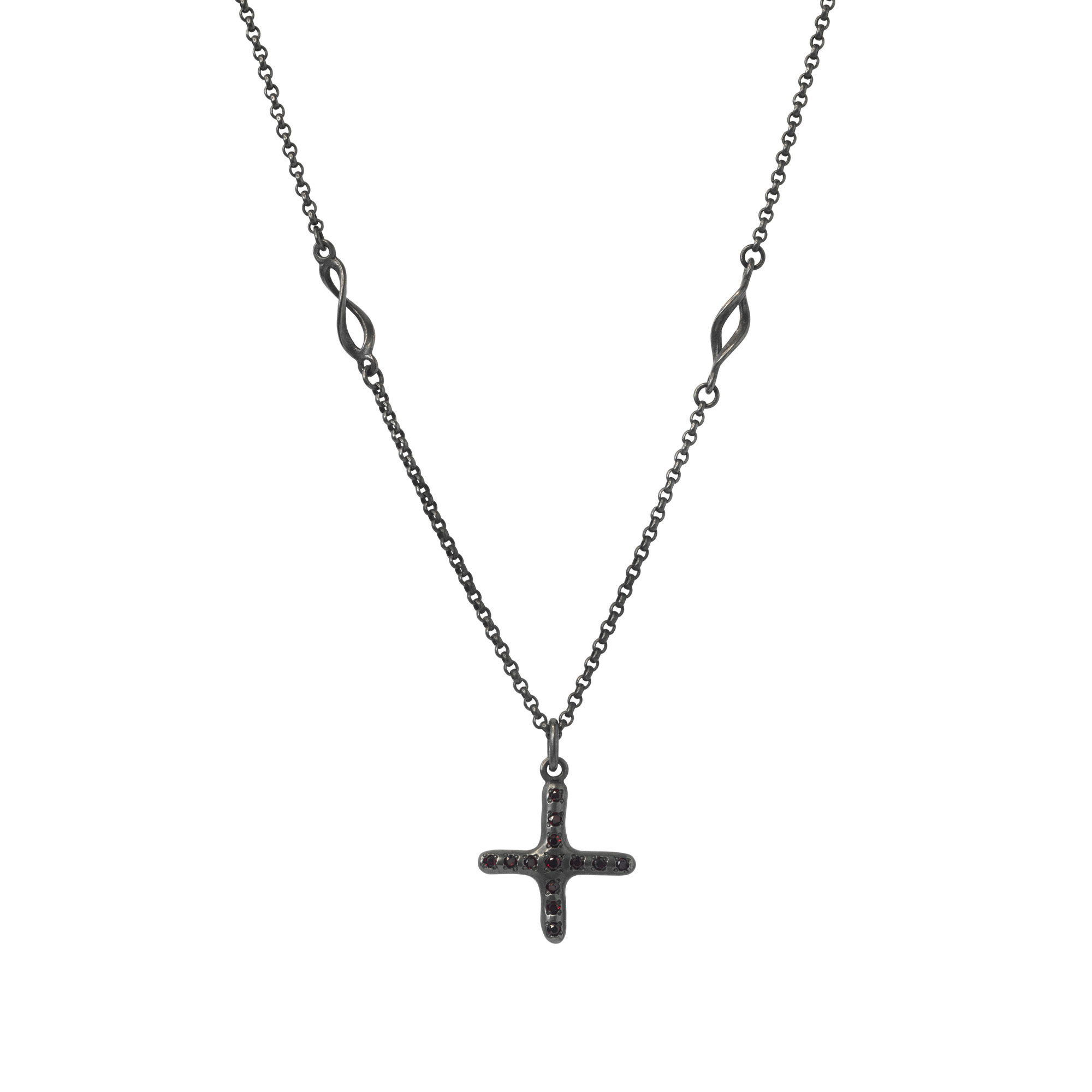 Black silver necklace with a cross pendant. Natural red garnet inserts. Chain with twisted decorative segments and a standard clasp.