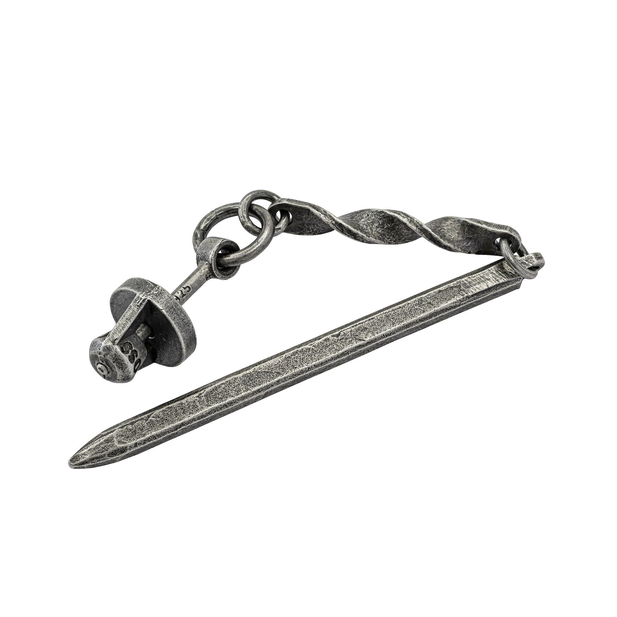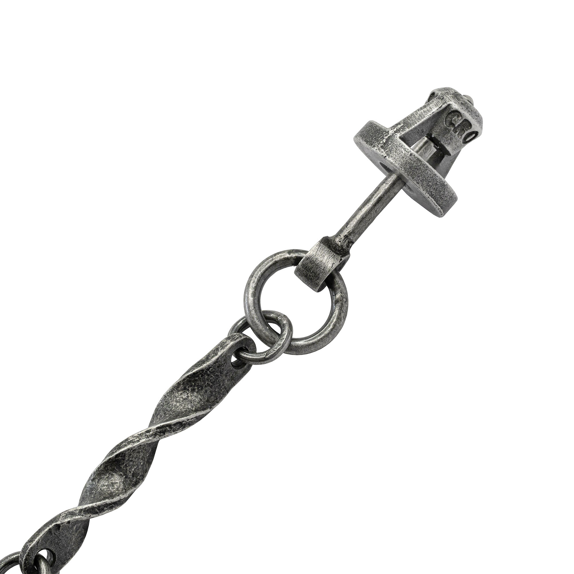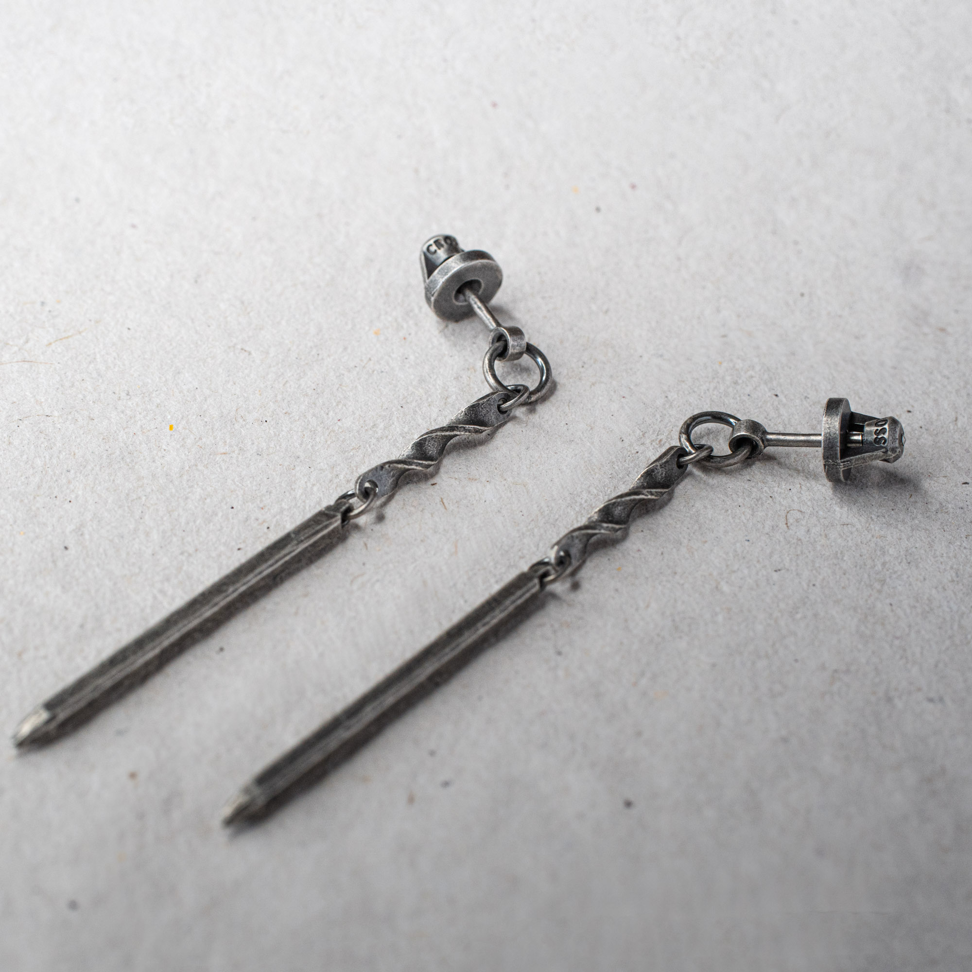 Long silver dangle earring with a spiral element. Oxidized finish with patina effect. Comfortable CROSS screw back.