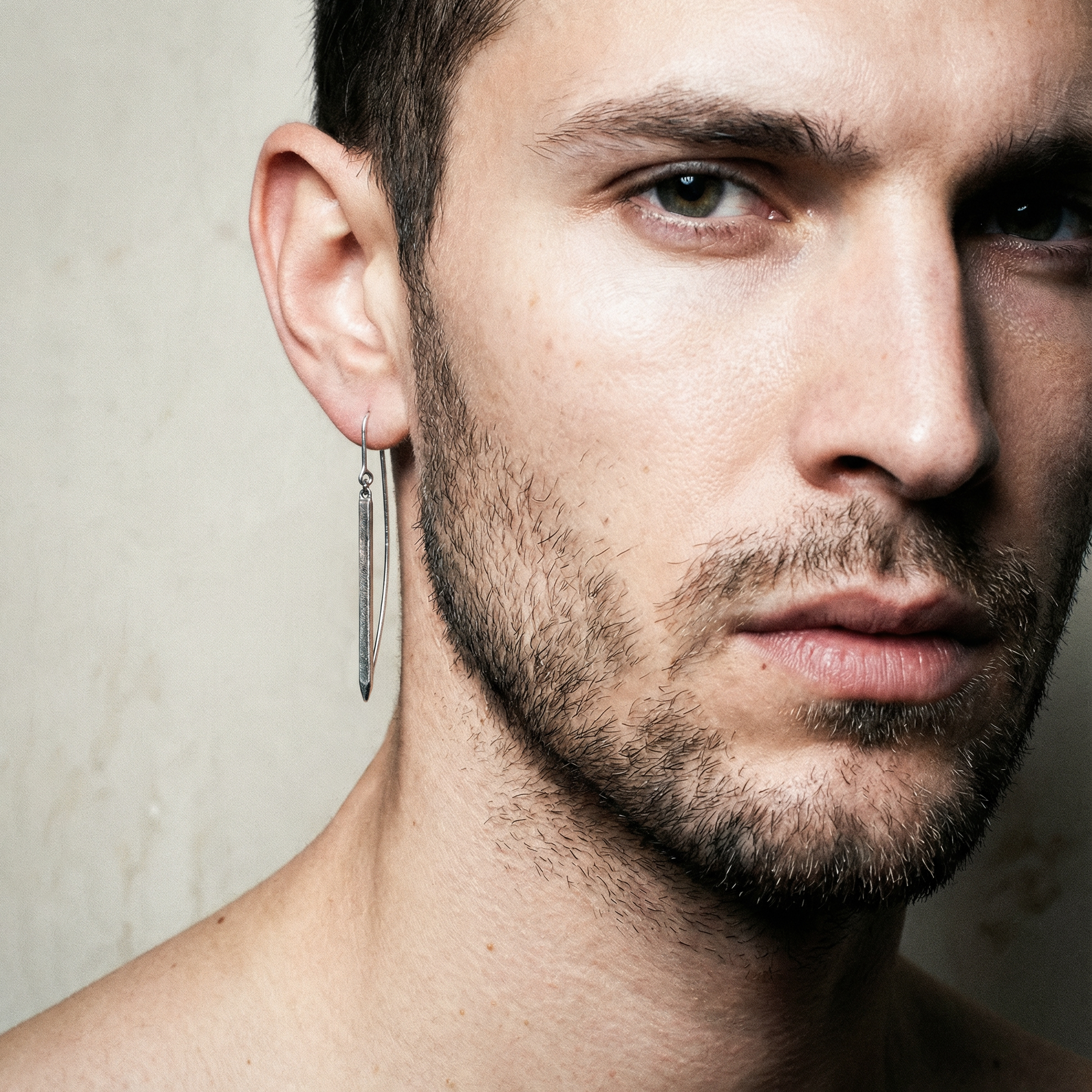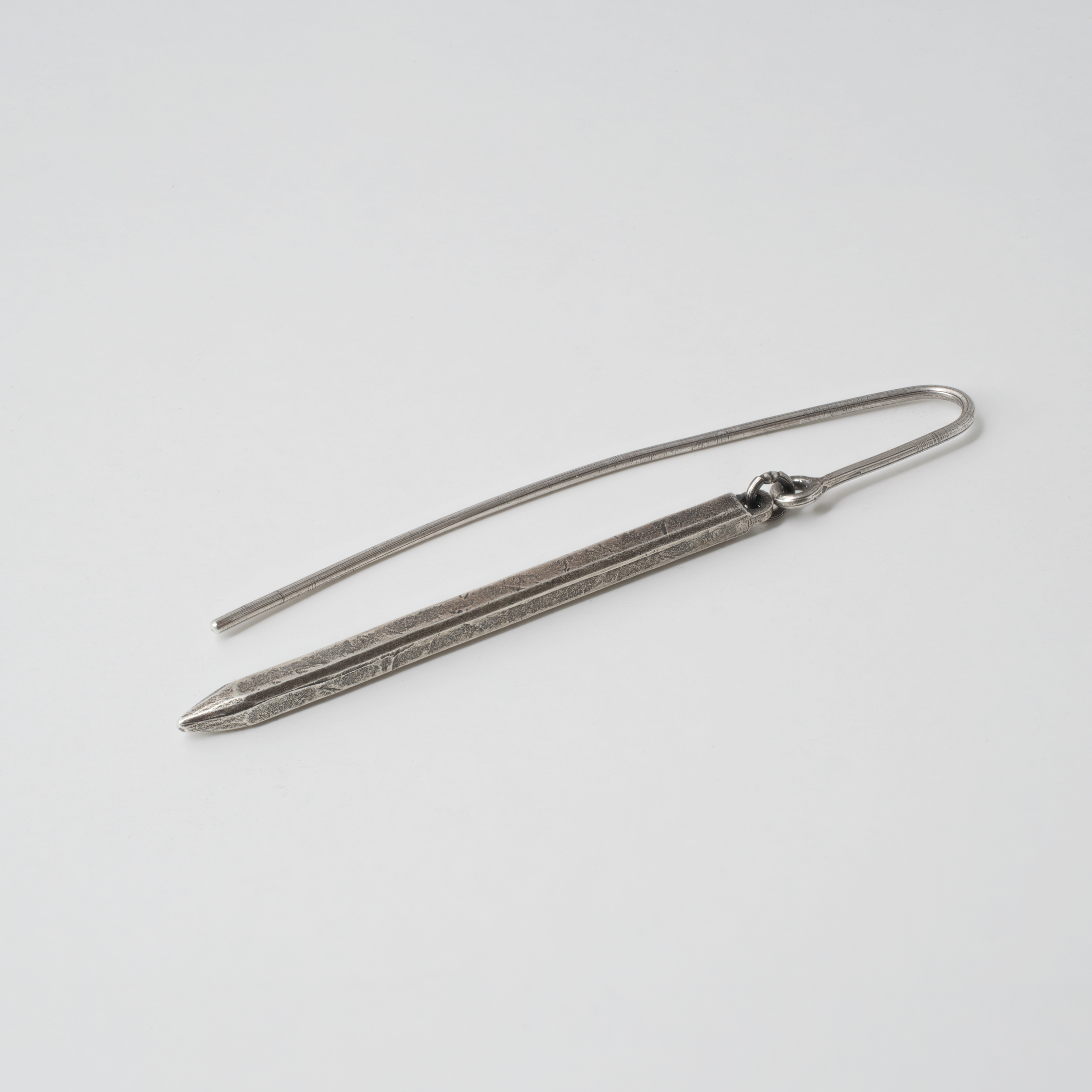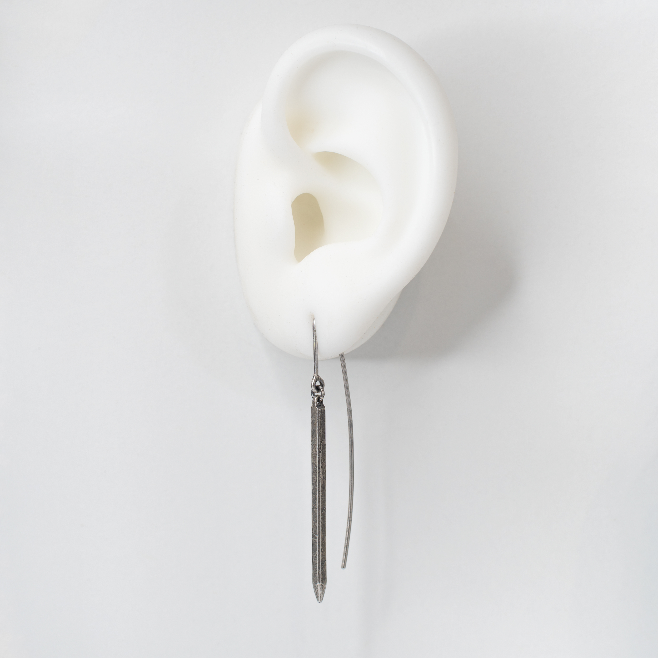 Silver stick earring hanging on a wire hook. Textured surface, oxidized silver finish with patina effect.